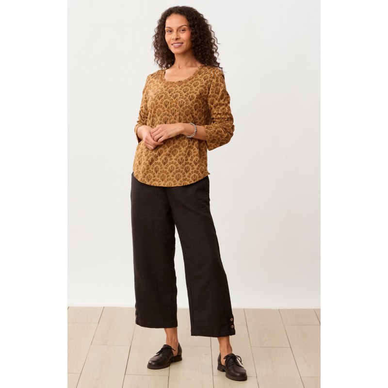 Our favorite straight leg pant now in a medium-weight cotton blend matelassé. This versatile fabric is woven so that is appears to be quilted, producing a diamond-shaped pattern and an appealing texture. The pant features an embroidered button detail at the hem. The flood length pull-on style sits at natural waist with an easy fit through hip and thigh.