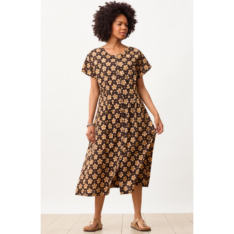 Easy summer-weight cotton dress with waist darts to give a flattering shape. Blockprinted with natural dyes in black, gold and natural, with hand embroidery accents on the bodice. Hem is slightly longer in the front to give a gentle sweep.