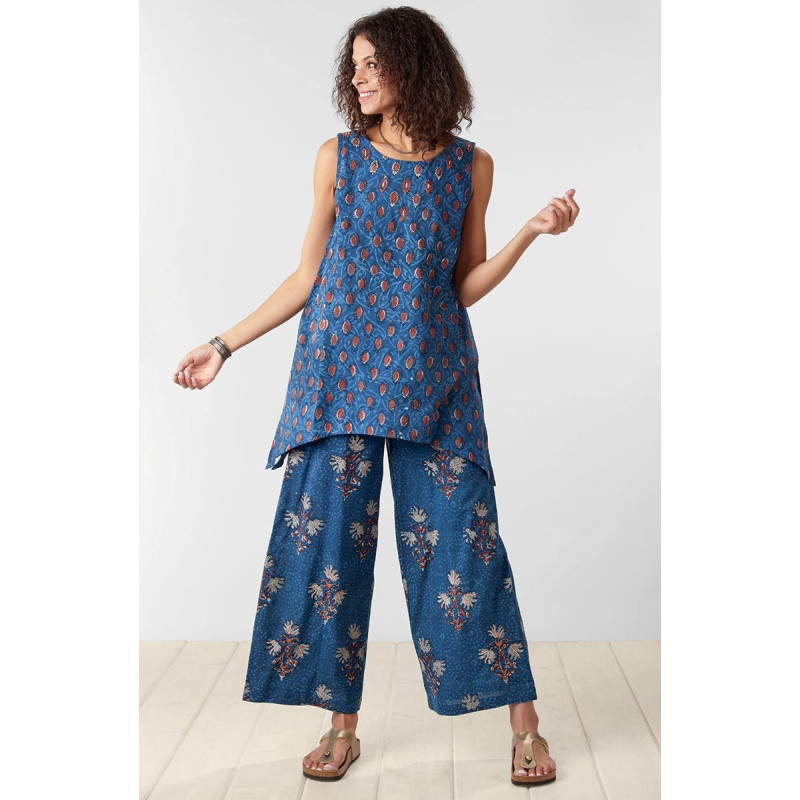 Our easy wide-leg pant in natural dye indigo block print with red floral accents. Flat front with drawstring, elastic back. Hand embroidery accents the print design.