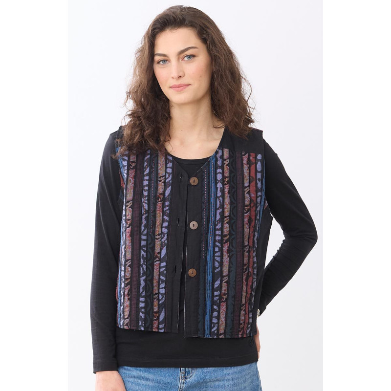 The MarketPlace short reversible vest returns! Our new version in our distinctive fabrics is more fun, with a swingy quality. One side has front panels of upcycled chindi stripes, with a blockprinted back. The other side is light blue ikat with red accents. Side slits, pockets on the side seams. chindi patchwork colors and patterns may vary due to the variety of upcycled fabrics.