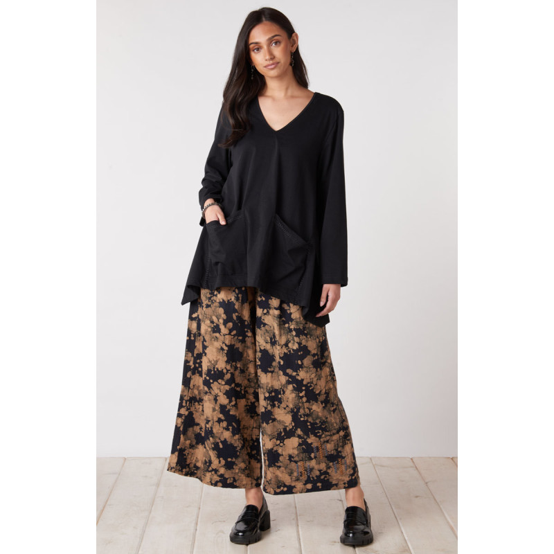 Soft double gauze straight leg pant is batik block printed in shades of brown and black. Wide legs have a gentle skirt-like swing. Drawstring waist and front pleats give an easy fit through hip and thigh. Hand embroidery accents at the hem.