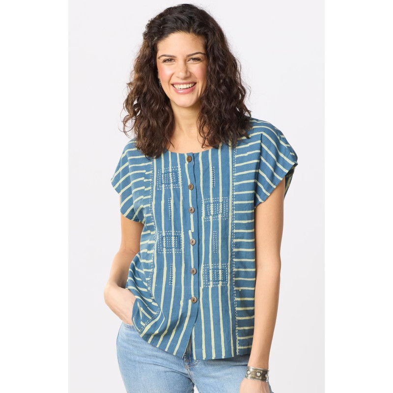 Flattering cap sleeve button-front top is blockprinted batik stripes in light and dark aquatic greens. Front panel is embellished with hand embroidery.