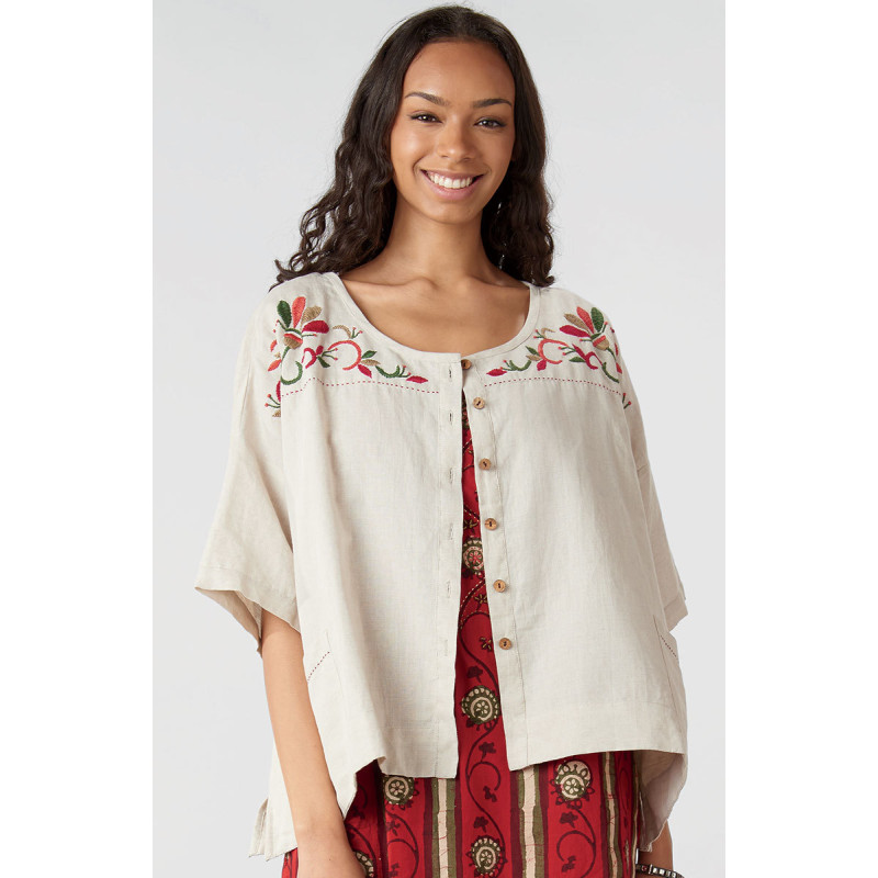 Scoop neck linen/cotton boxy shirt showcases intricate red and green hand embroidery across the shoulder yoke. Side slits give a gentle sweep. Wear alone or layered! Generously cut - consider sizing down for a less oversized look.