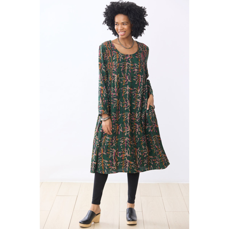 Soft forest green cotton crepe dress with batik and block handprints in autumn colors. Side pleats front and back, and a swingy skirt with a full sweep. Hand embroidery accents the front pleats.