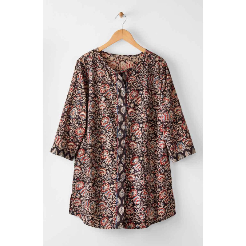 Button-front A-line Kalamkari tunic in rich black, blue and red natural dye block prints. Contrast placket and cuffs. Shirttail hem, round neck. Tonal hand embroidery highlights on the floral design.