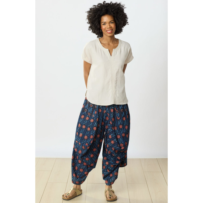 When you're ready for that eye-catching style, this draped leg pant is what you need. Handprinted in natural indigo and madder dyes, the unique wide-leg gathers make this cotton pant a must-have style. Elastic waist. Hand embroidery accents on front pockets.