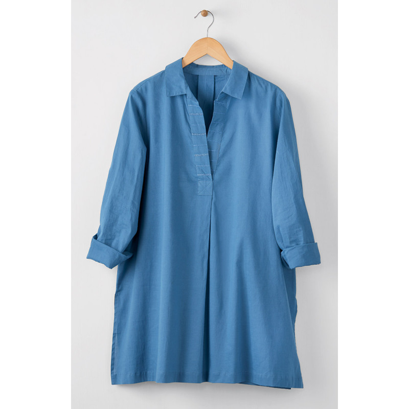 A style that works without even trying. Soft eco-friendly organic cotton shirt in Natural Dye Indigo blue. Tone-on-tone hand embroidery accents V-neck, center pleats front and back. Deep side slits give an easy sweep. Long sleeves with button cuffs.